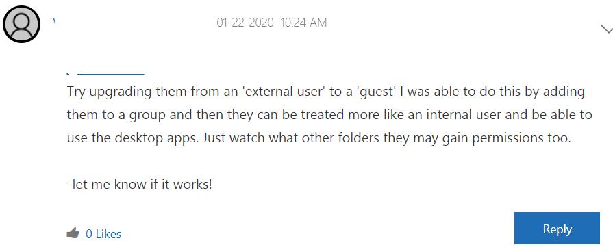 Upon accessing the file, they only have the option to view the file online, not to open in desktop app. My colleagues (two of them are the only external users) and only the external users have an issue for opening the file in desktop app.