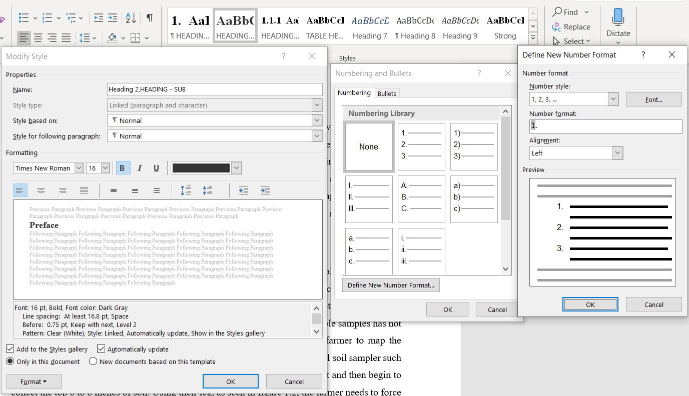 I want the numbering to automatically update so that I can later use the Table of Contents to seamlessly put the sections together with the page numbers. I've tried modifying the heading option but I cannot find the option to create a multilevel heading. The following is the closest I've gotten to finding the option I'm looking for.