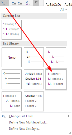 Click the Multilevel List button, and select the option to use 1, 1.1 etc., with Heading 1, Heading 2 etc.: