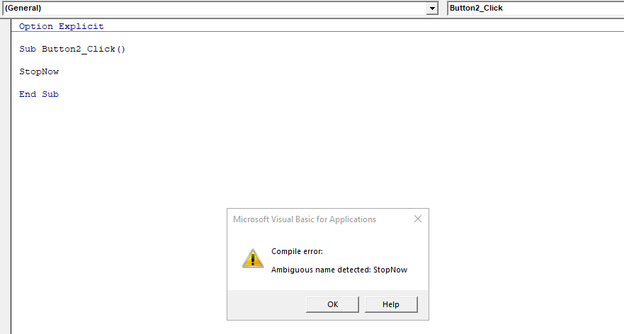Check whether you have created two macros named StopNow. There should be only one.