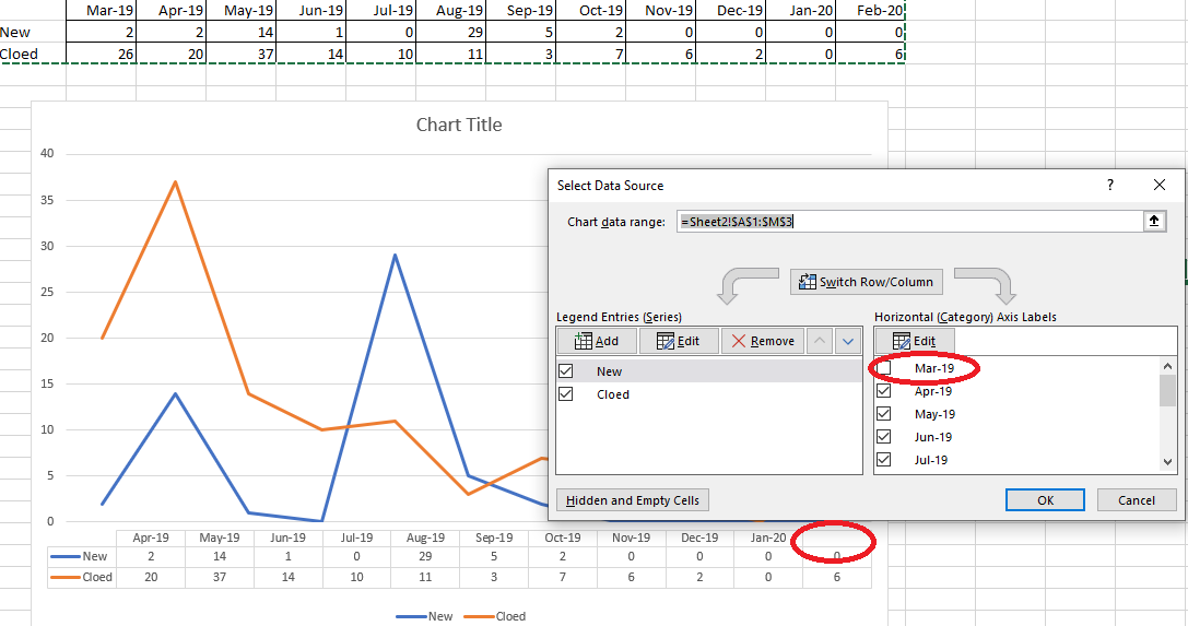 Thank you for posting your concern here in Microsoft Community! I hope you're having a great day despite the trouble you're experiencing with Excel Chart. We tried replicating the issue here and we've experience the same behavior. When we removed the Mar-19 item under Select Data, the Feb-20 data disappeared. See screenshot below: