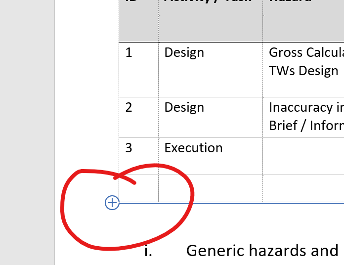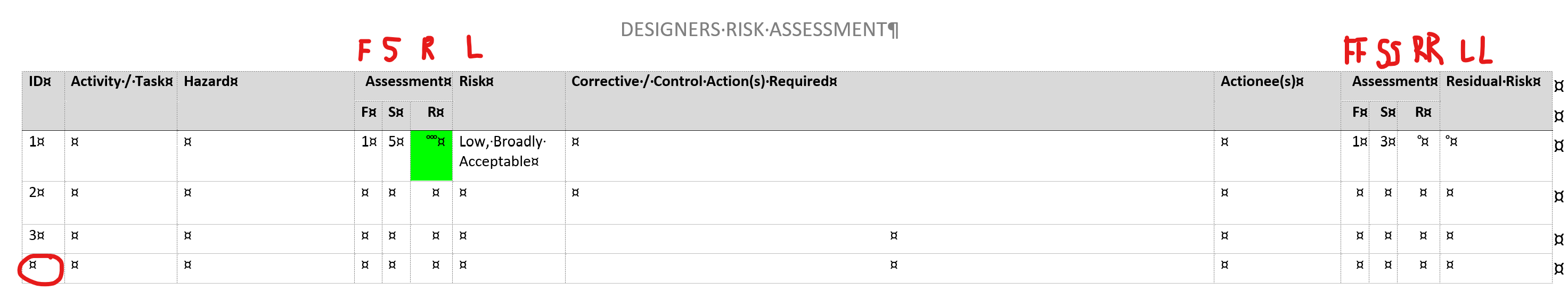 - Insert plain text content controls in all four cells (and in the corresponding cells of other rows). Give each control a unique Tag value that includes the row number. For the example, I would use tags like F1, S1, R1, and Risk1, and just change the number for each additional row. (These don't have to be the actual row numbers.)
