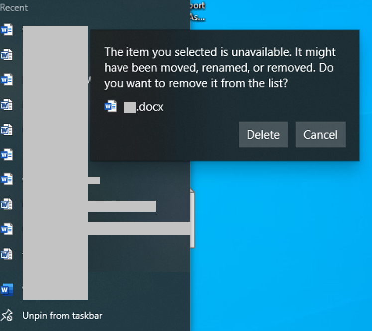 Per your description, it’s not available to open a Word document from Word icon pinned list on taskbar. Given such situation, I have test it on Word 2001 version on Windows 10, it opens as expected. However, if I delete the document, I get the similar error message as yours. May I confirm have you deleted the file?