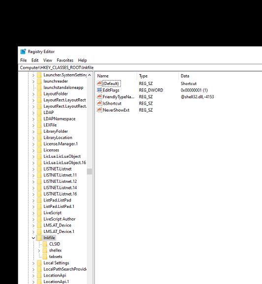- Navigate to the following registry key: HKEY_CLASSES_ROOT\lnkfile
