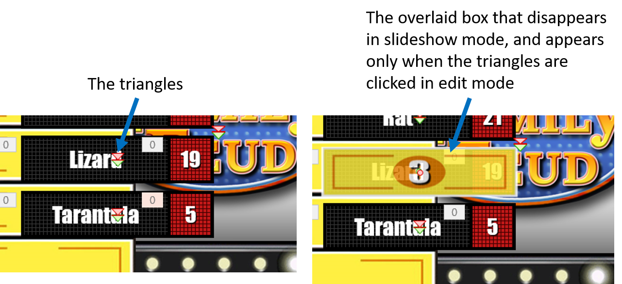 Specific question: on the PowerPoint I am working with, in slideshow mode, a box with a number in the center is clicked, then it "disappears" revealing a message in a box. However, in edit mode, the box that you click is not present. The message box is visible, and has two small downward-pointing triangles (a red and green) in the middle of it. When I click the triangles (still in edit mode), the overlaid box with a number is revealed, but slightly transparent. When I try to click the number box so I can work with it, it disappears. It cannot be found anywhere else on the page, it only appears when the triangles are clicked.