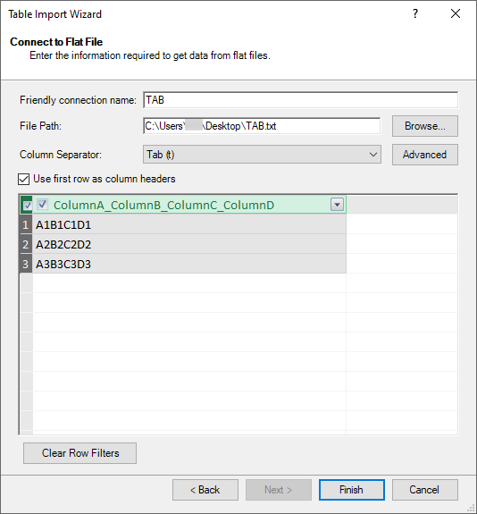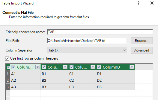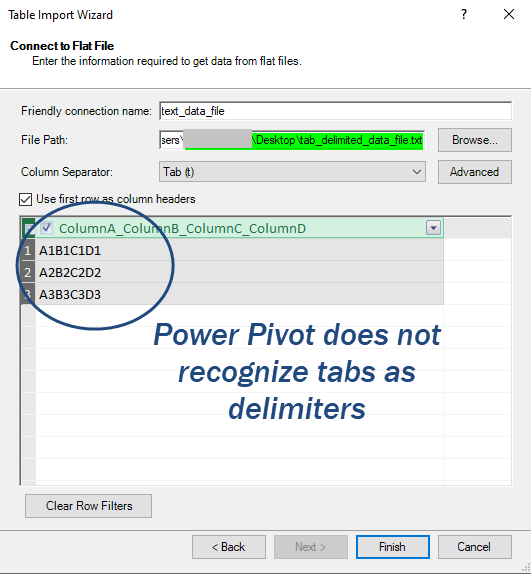 When I attempt to import this file using Power Pivot, you can see that the tabs are not recognized as delimiters: