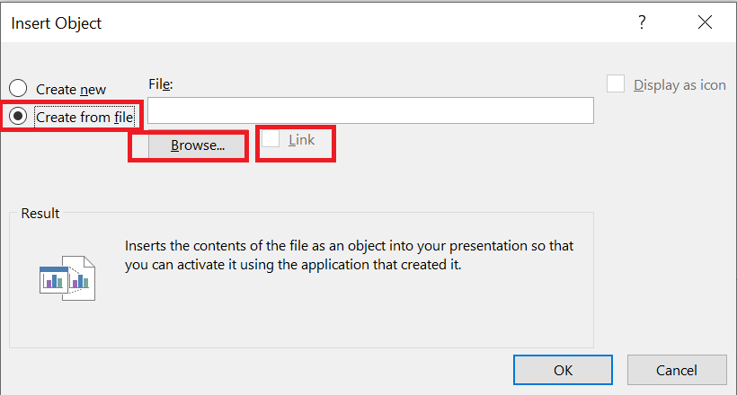 - Select Create from file, and click Browse to select the Excel file which was synced to the File Explorer. After selecting the file, you can see the Link is available, then you can check this option. Click OK.