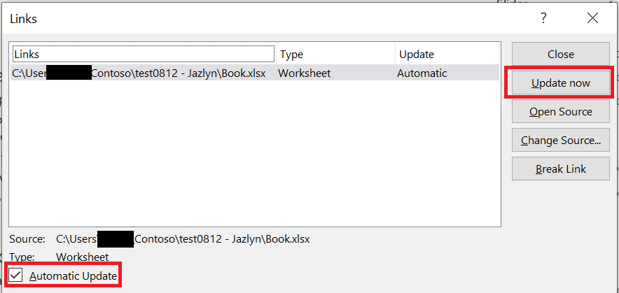 - A window like below will pop up. Then you can select the linked file and click Update now.