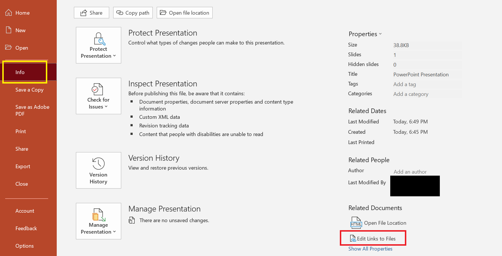 - Since this file is stored in the SharePoint, then it will save the changes automatically. Then go File > Info > scroll down to find and click Edit Links to Files under Related Documents section.