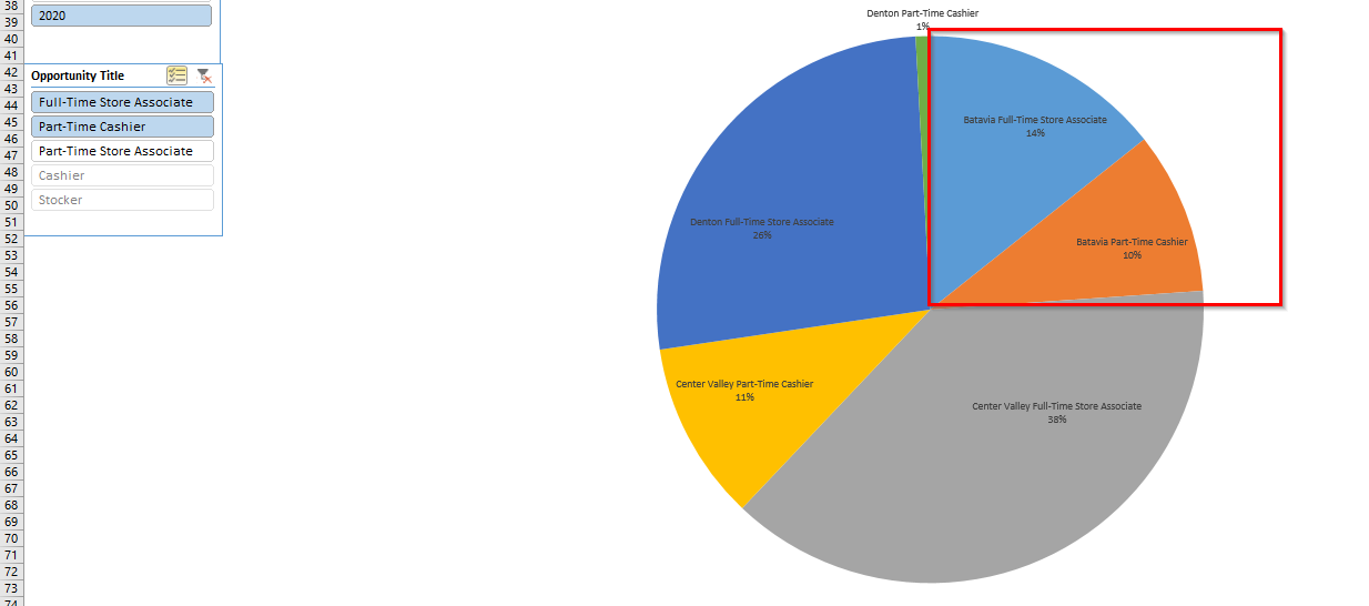 Assume if I want to see how many Store Managers and Cashiers there are at each location (as a single slice of the pie), how can I achieve this with the pie chart? When using the slicer and selecting Store Managers and Cashiers, the pie chart will give each position it's own slice: Location (A,B,C) - Cashier, Location (A, B, C) - Store Manager. This can quickly get overwhelmingly cluttered if selecting all positions as there would be 5 separate slices for each of the 3 locations.