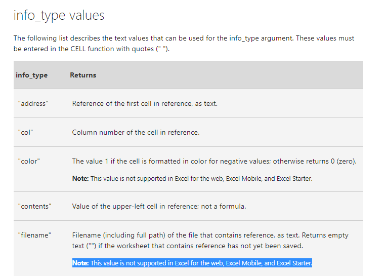 For the CELL function, refer to CELL function, the “filename” info_type” is not supported in Excel for the web, Excel Mobile, and Excel starter. This is a very specific restriction to this info_type. If you change the info_type to another one, for example, “address”, you will find that it works in Excel for web.