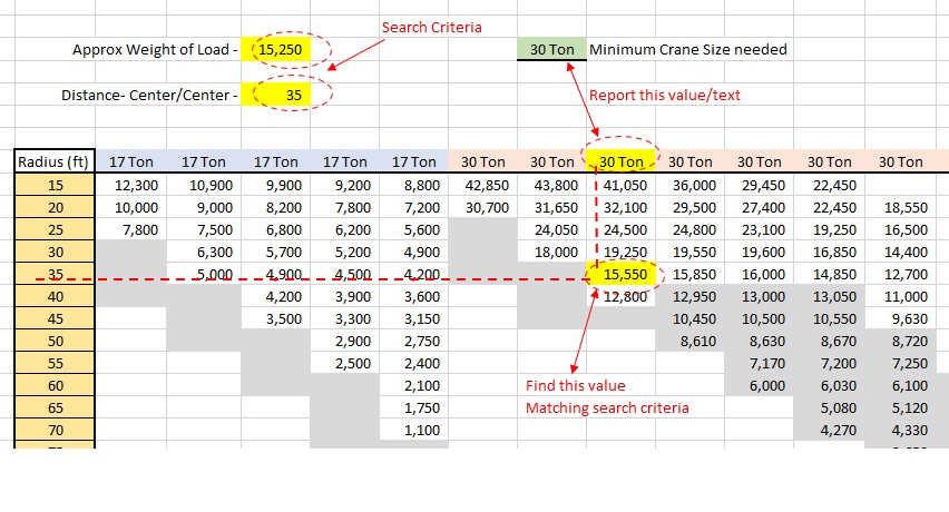 Based on the Weight & Distance criteria (in yellow), find the corresponding value in the table and report back the "minimum" size of crane needed to safely lift the load.
