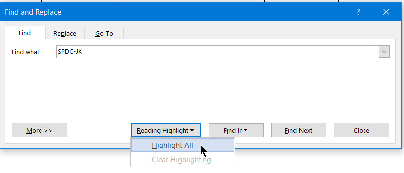 If highlighting just the SPDC-JK, you could simply use the Find and Replace feature to find SPDC-JK and then select Highlight All from the Reading Highlight dropdown
