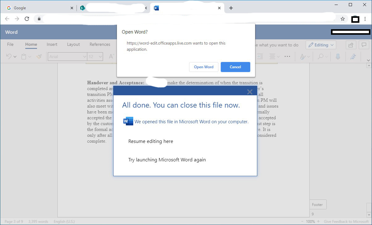 I am unable to open a Word document from a team SharePoint folder using 'Open in Desktop App' on my own PC which is running Windows 10 and Office 2019. A window opens that says 'https://word-edit.officeapps.com want to open this application.' When I click Open, I am directed to Sign In.