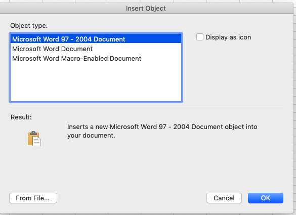 Arck Tang is correct that PDF is not a supported file type on a Mac. In fact, Object Linking & Embedding [OLE] is a Windows technology which never has been supported by the Mac operating system. Microsoft does have special dispensation from Apple to implement OLE for Word & Excel file types but that's it. Some other file types (including PDF) can be inserted as objects but are rendered simply as single-page images.