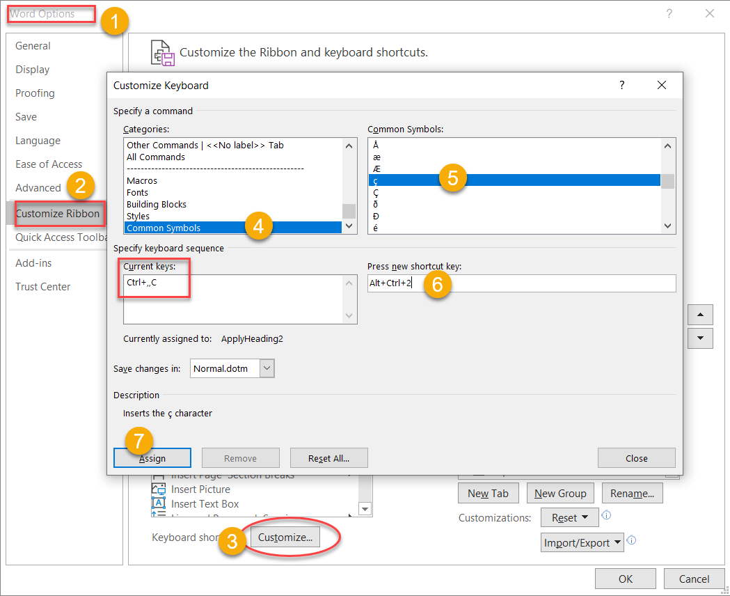 File > (1) Options > (2) Customize the Ribbon > (3) Keyboard Shortcuts: Customize