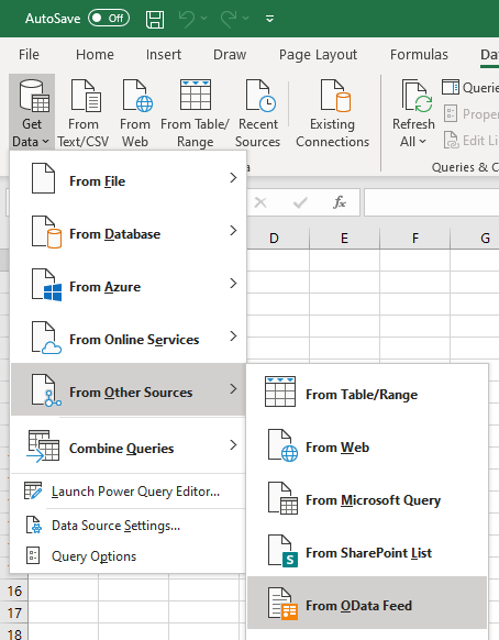 2. Open Excel > Data > Get Data > From Other Sources > From OData Feed