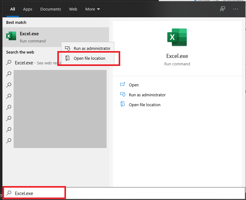 If you are not sure about the location you can go to Start menu, search “Excel.exe” to open file location to find the directory.