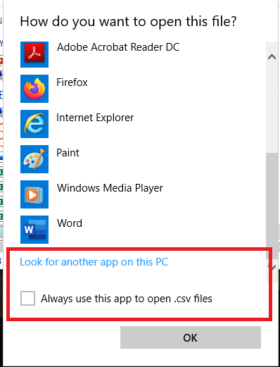 2: Scroll the list to the bottom and choose “Look for another app on this PC”. and check the option “Always use this app to open .csv files.”