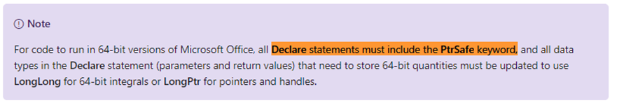 Based on this error message, generally this error requires Declare Statements to include PtrSafe keyword when it is running in 64-bit version.