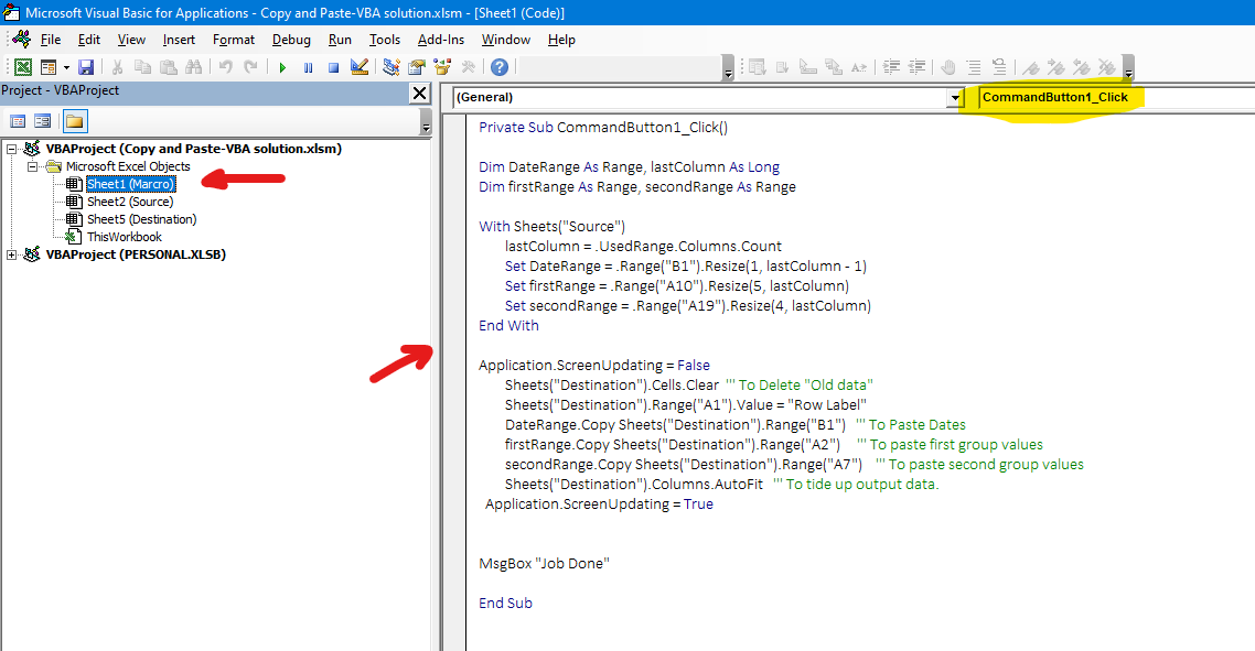 1- Sheets("Destination") refers to Sheets("Sheet1") on your original code