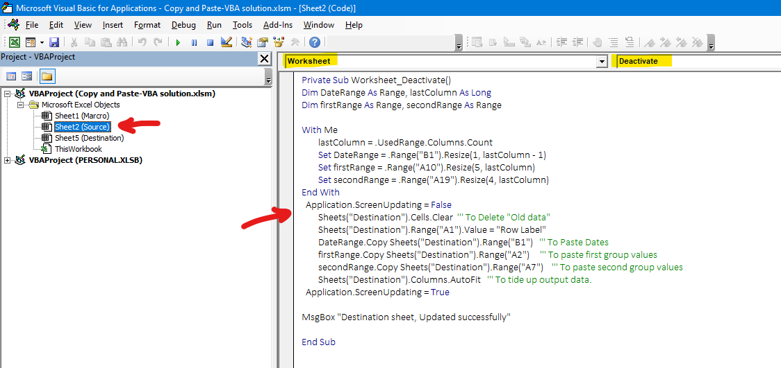 In this case, the macro will run automatically once you deactivate (leave) the "Source" sheet to select any other sheet in the workbook. So when you finish the update on "Source" sheet, once you select the "Destination" sheet it will update instantly