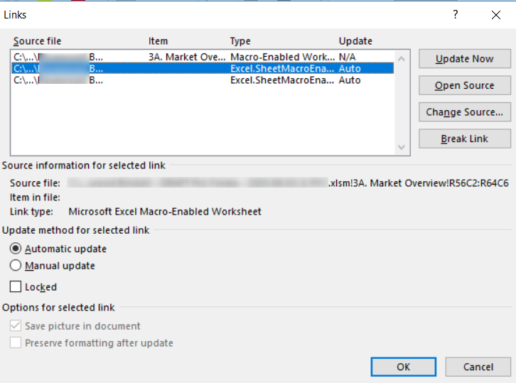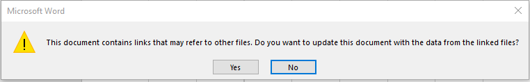 Related thread: Links between Word and Excel do not work if the source file is not opened