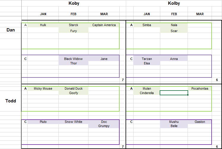 At my company, we work with 270-some clients. Each client has a planner, and an associate on their team. In addition to this, each client is assigned a month, and we also give them a complexity-rating of sort- A, B, or C. This all fits well in an excel list,