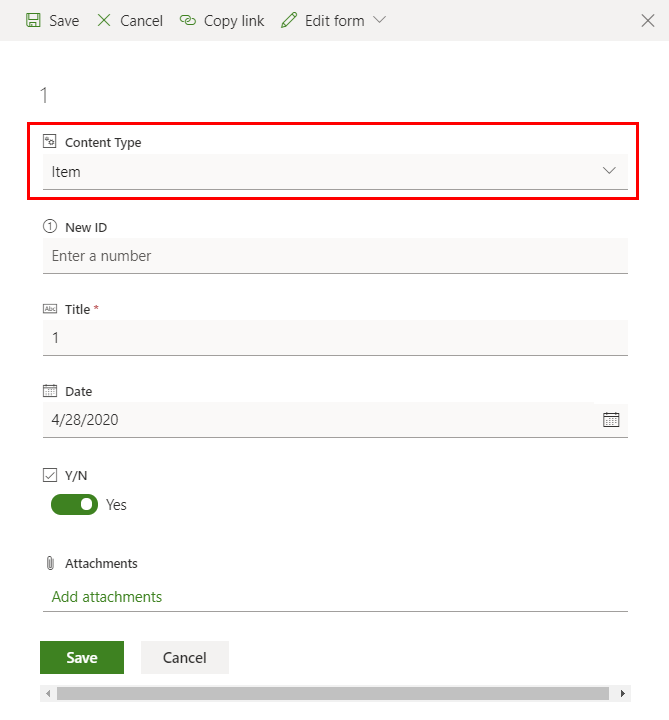 - The column order of the existing items and be item will be changed, if you don’t want to show the “Content Type” field, you can go to step 1 and turn off “Allow management of content types?”, the column order will still take effect.