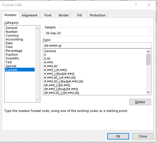 Select all of the cells that you want to be formatted with this date format. Open the Format Cells Dialogue Box by right clicking in the selection and choosing Format Cells. Select the Number tab, and Custom. In the Type: line, enter dd-mmm-yy as below and click OK.