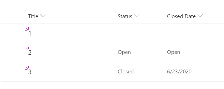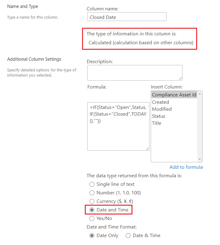Click “+Add column” > More… > choose “Calculated (calculation based on other columns)” > type the formula =IF(Status="Open",Status,IF(Status="Closed",TODAY(),"")) > set the return value type to “Date” > save the changes.