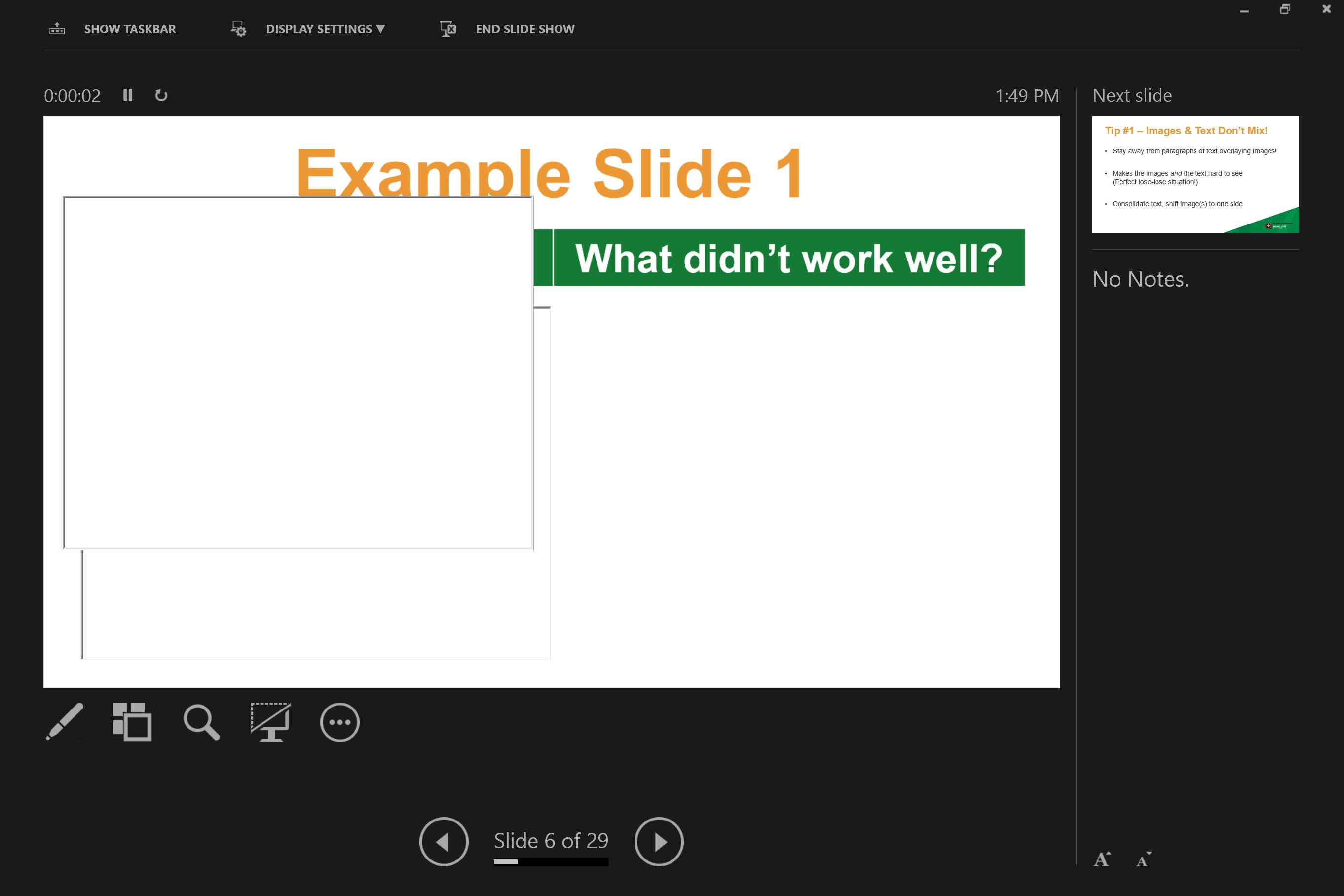Please choose File>Options>Advanced, scroll down to the Display section and check the box beside Disable Slide Show hardware graphics acceleration.