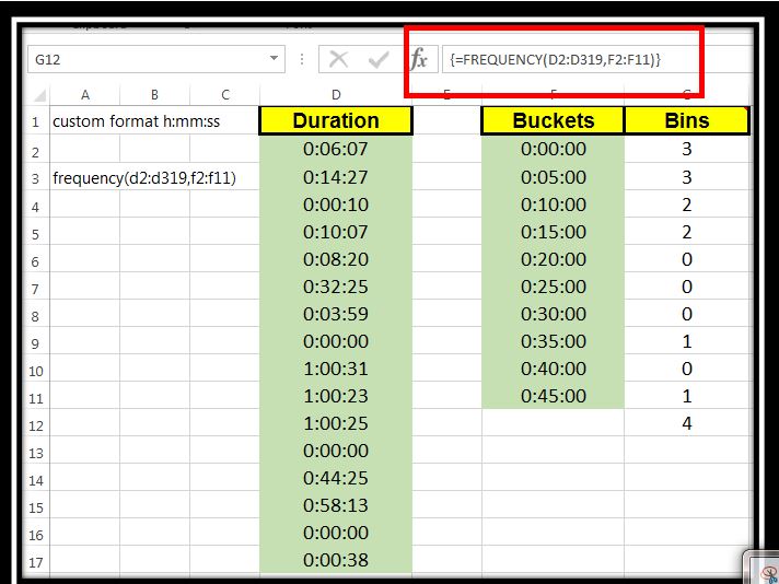 I am trying to take the duration data from a webinar and display it graphically via a histogram or bar chart. In cells G2:G11 tried using =frequency(d2:d319,f2:f11) but I keep getting all zeros. I am using custom format h:mm:ss in both columns.