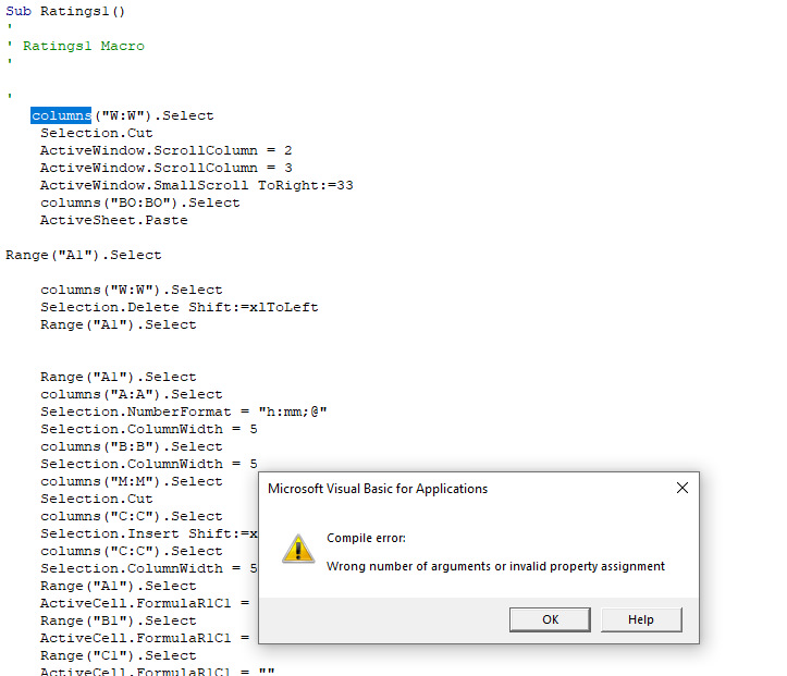 I have been using a recorded Excel macro in Excel to reformat text and columns. It has worked perfectly for months until today when the error below is produced. I'm not a coder but I think this must be something simple I'm missing.