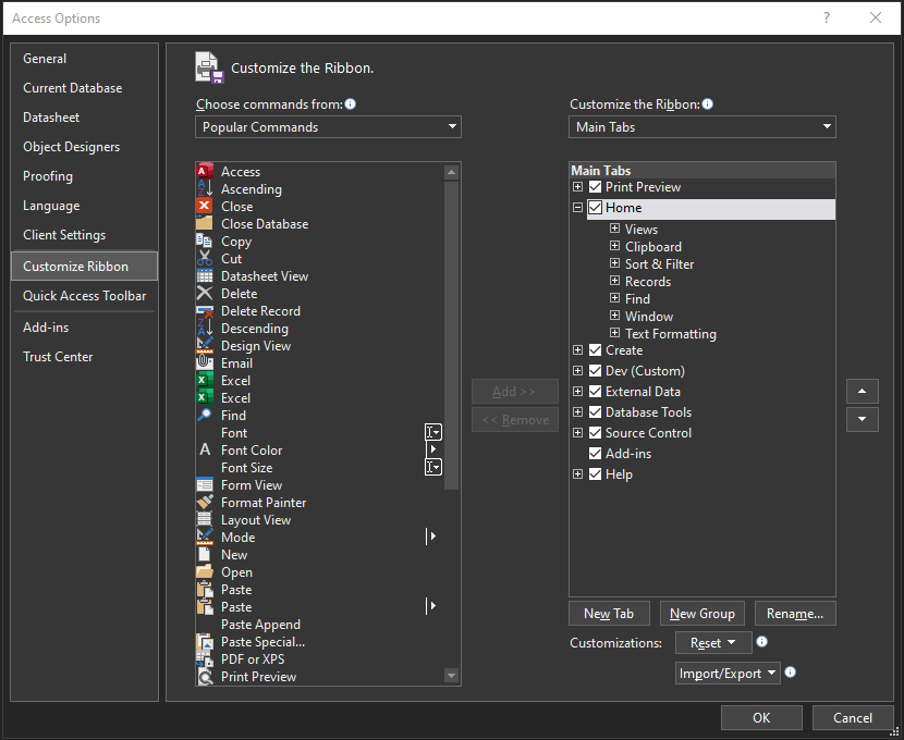I just found out the "Developer" tab is missing from the Ribbon. This is normal for new installations (even though mine is not), and I know how to enable it in "Customize the Ribbon". However, the Developer tab which needs to be enabled is not there. I have checked Excel and Outlook and the Developer is available and can be enabled. So, it's only Access where it's missing (see image, note that the "Dev" tab in the image is a workaround customized tab created by me).
