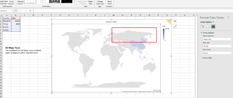 You can see my test result here, Russia displays normally on the Map even there is no data in the sheet. Given this situation, we suggest you go to Excel-> File-> Update Options-> Update Now to use the latest version of Semi-Annual Enterprise Channel and check the result.