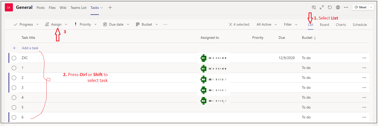 There is, however, a workaround, if you are using Microsoft Teams and have the plan added as a tab, go to the 'List' view. From the List view, you can select multiple tasks by holding down the Shift or Ctrl key. Then you can select Assign at the top to bulk update user. You can also select Progress, Priority, Due Date, and Bucket to bulk update.