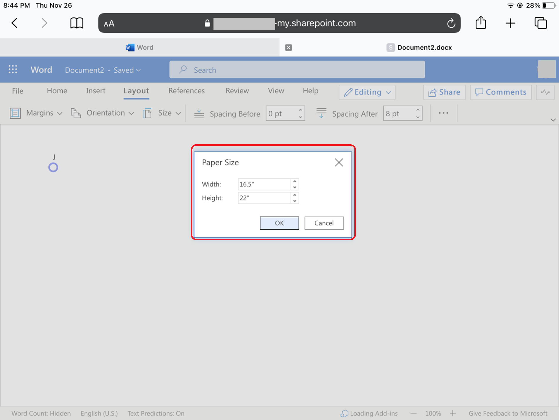 However, there is a workaround you can consider using. Since Word for the web application allows user to create a custom size page in Word document, you can create the document in Word for the web in browser by Layout > Size > Custom Page, which the file will be saved to your OneDrive/SharePoint.