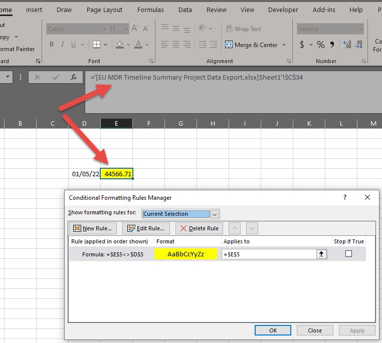In the cell that imports the date from the MS project file, the formula is ='[EU MDR Timeline Summary Project Data Export.xlsx]Sheet1'!$C$34 . If I don't format the cell which is in the General Format, the value that is imported as 44566.71 which using the following conditional format, I can see what cell E5 shows up as yellow as 44566.71 <> 01/05/21 in cell D5 which is a Date Format.
