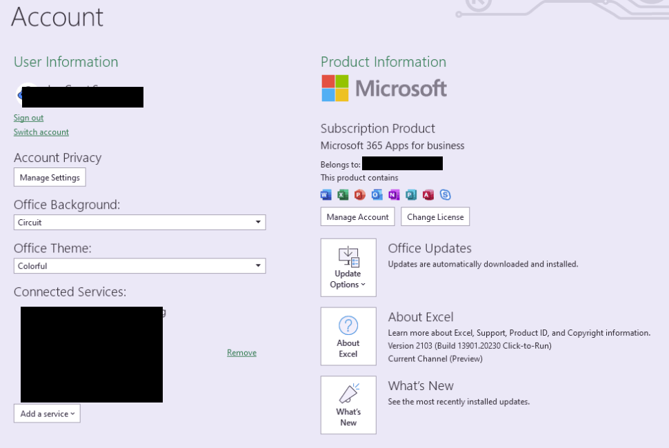 Additionally, please provide a screenshot of your Office Product Information(open Excel>File>Account>capture a screenshot of the Product Information column).
