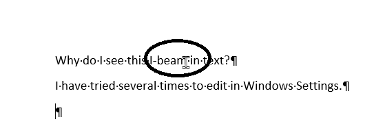 Fortunately, reversing this is simple: Just click either of the first two boxes under "Change pointer color". The leftmost one is the Windows default, which will also restore the I-beam text cursor.