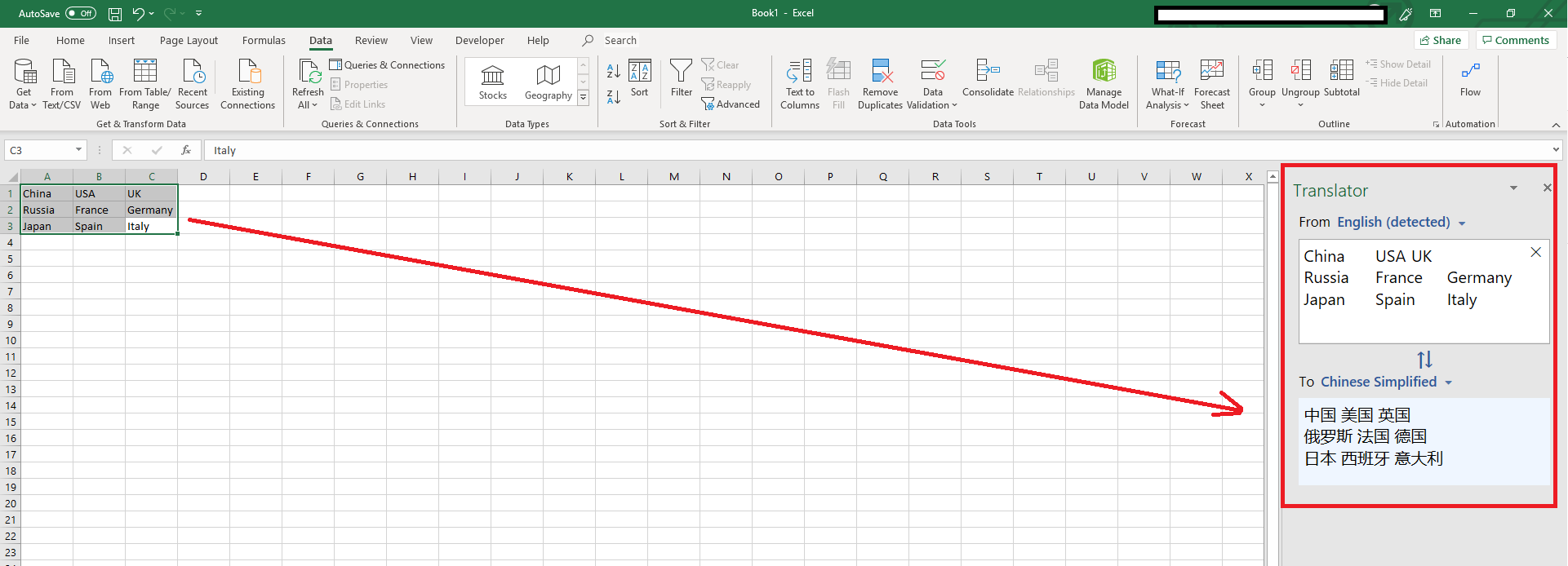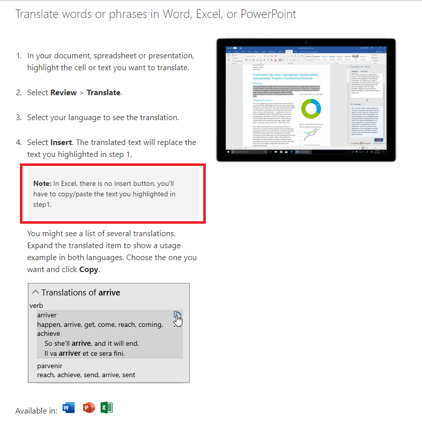 According to this Microsoft official article Translate text into a different language, in this part it notes that “In Excel, there is no Insert button, you'll have to copy/paste the text you highlighted in step1.”