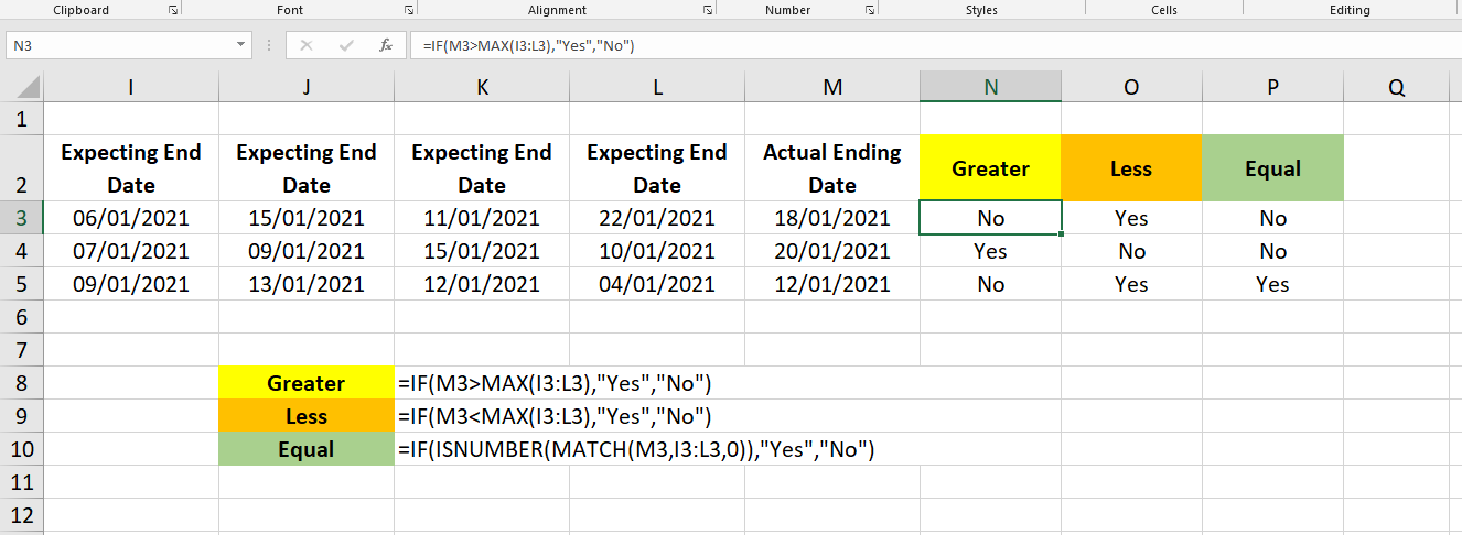 Greater =IF(M3>MAX(I3:L3),"Yes","No")