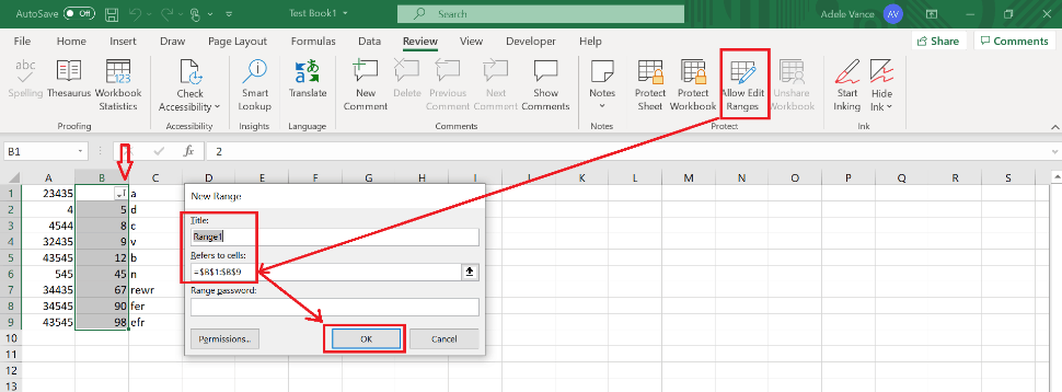 2.Then keep the selected column range selected and click Review > Allow Users to Edit Ranges.