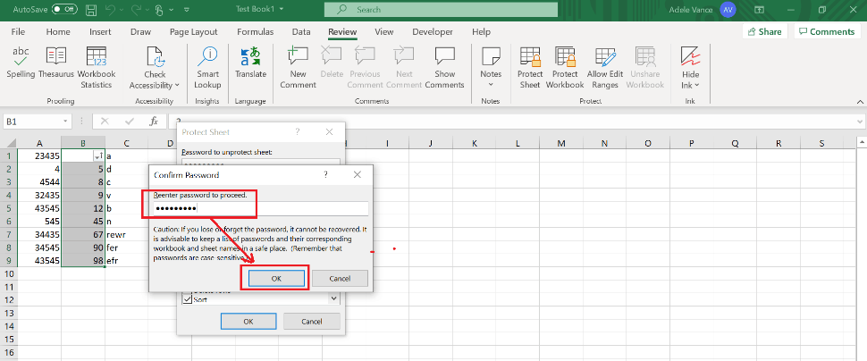 - Click OK and retype the password in the textbox in the****Confirm Password dialog. Click OK to finish the sheet protecting.