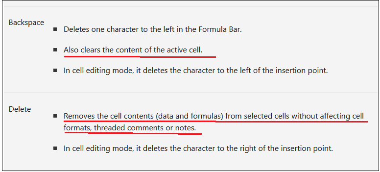 Backspace clears the content of the active cell i.e., it only can clear the first cell where we start selecting. In other Office apps, e.g., Word, we can select multiple lines and press Backspace which will delete all the selected data at once but in case of Excel, it is different. So, if you are deleting content from multiple cells in Excel, Delete key should remove the content from the selected cells at once.
