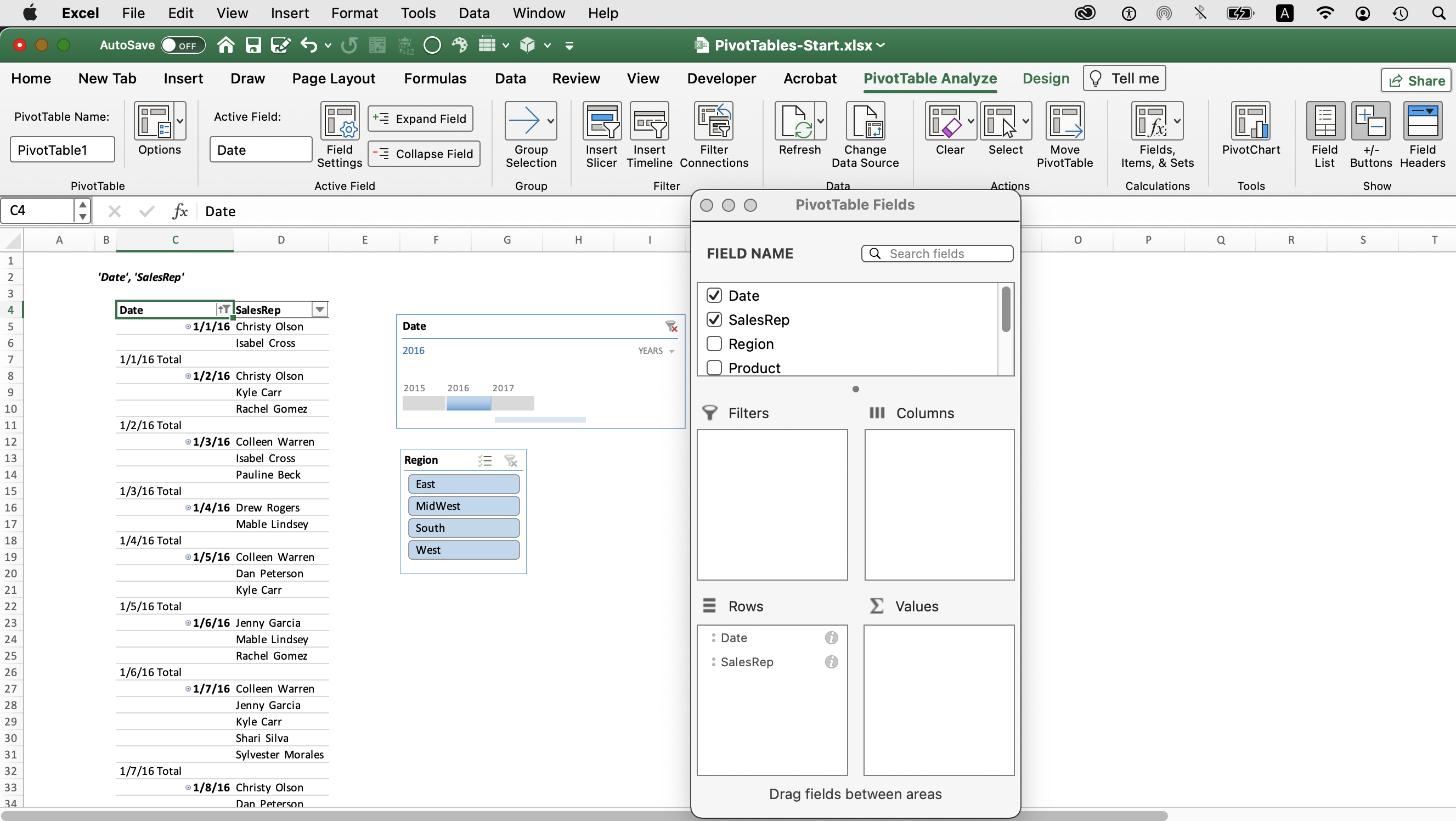 PivotTables, Slicers and TimeLines are supported in Excel for Mac. I can not download your example file because Cliff obliterated the download link you provided.