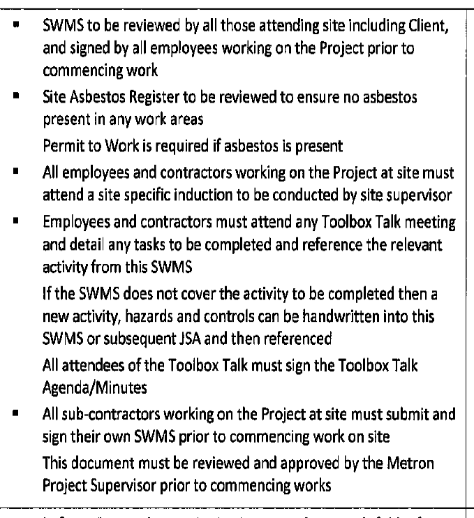· SWMS to be reviewed by all those attending site including Client, and signed by all employees working on the Project prior to commencing work