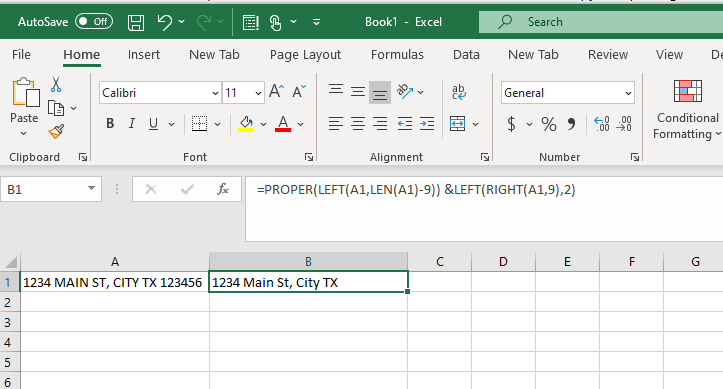 I copy that data into another tab to format it, so that I can copy it into an email message as well as into another spreadsheet. I use the "PROPER" function for that, which gives me: 1234 Main St, City Tx 123456