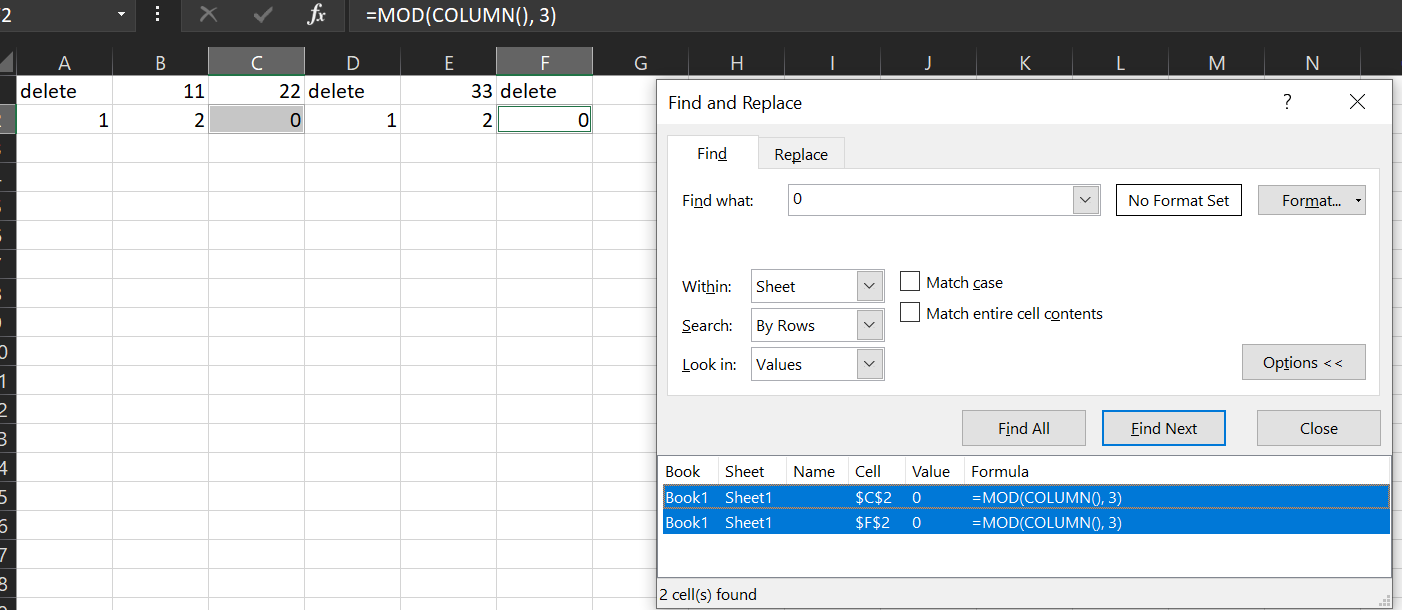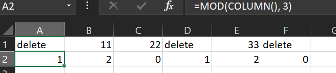 About how to delete every third column, you need to add a help row first and enter MOD() formula like below.
